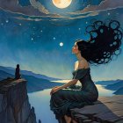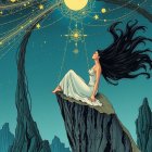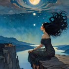 Woman with Long flying black Hair, sitting on edge of cliff, starlight, Style: Möbius, Daniel Merriam, Egon Schiele, Alphonse Mucha, Anna Dittman, illustration