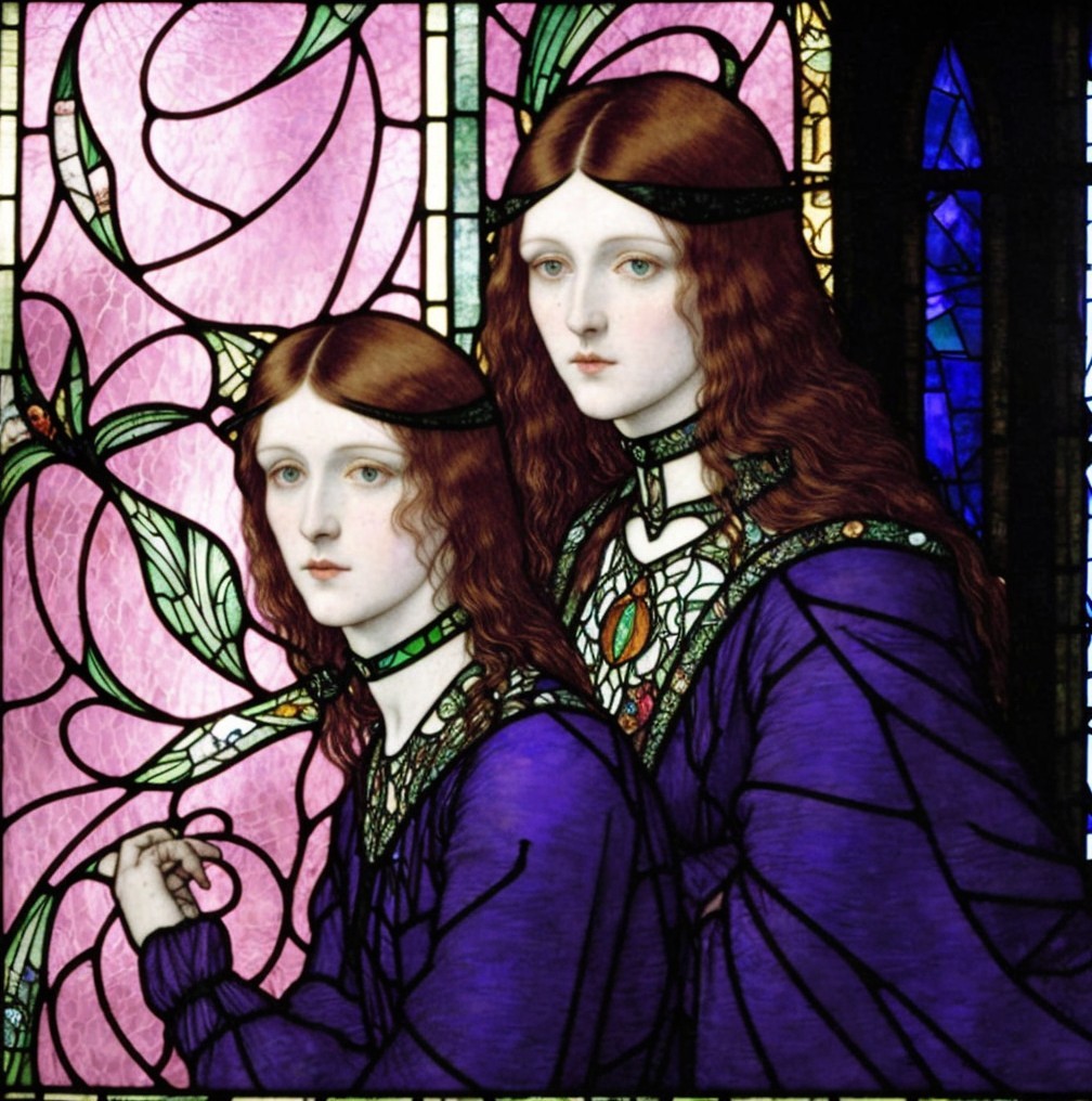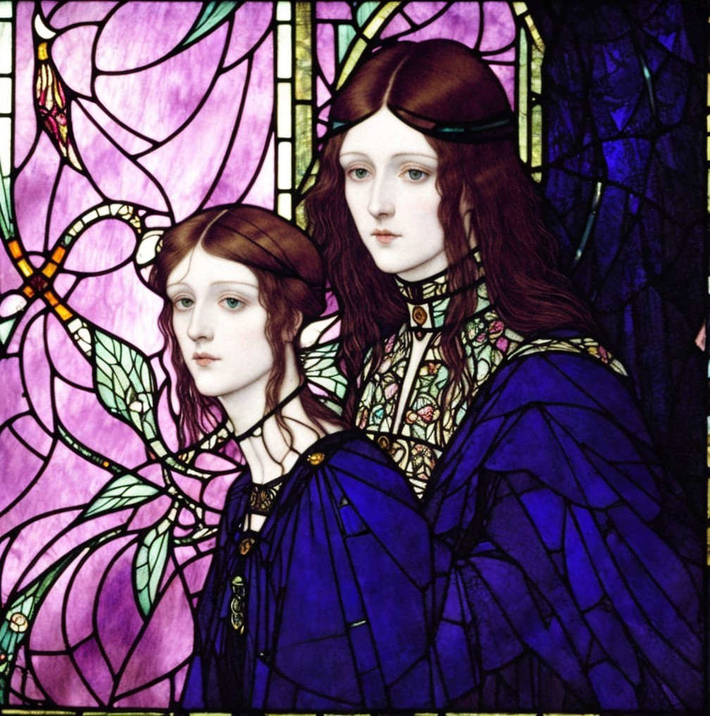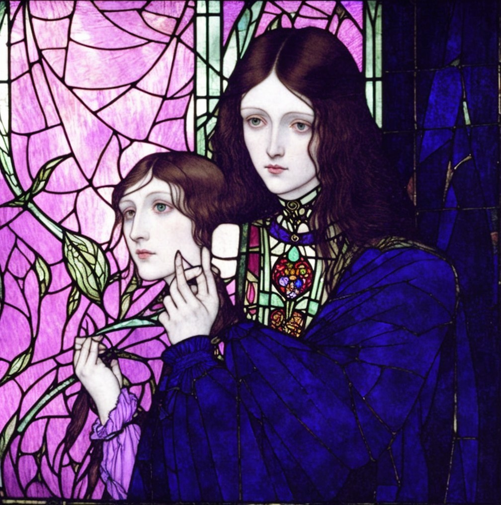 The image features two women with long, flowing hair, dressed in purple garments, set against a vibrant stained glass backdrop adorned with floral motifs. Their expressions are serene and introspective.