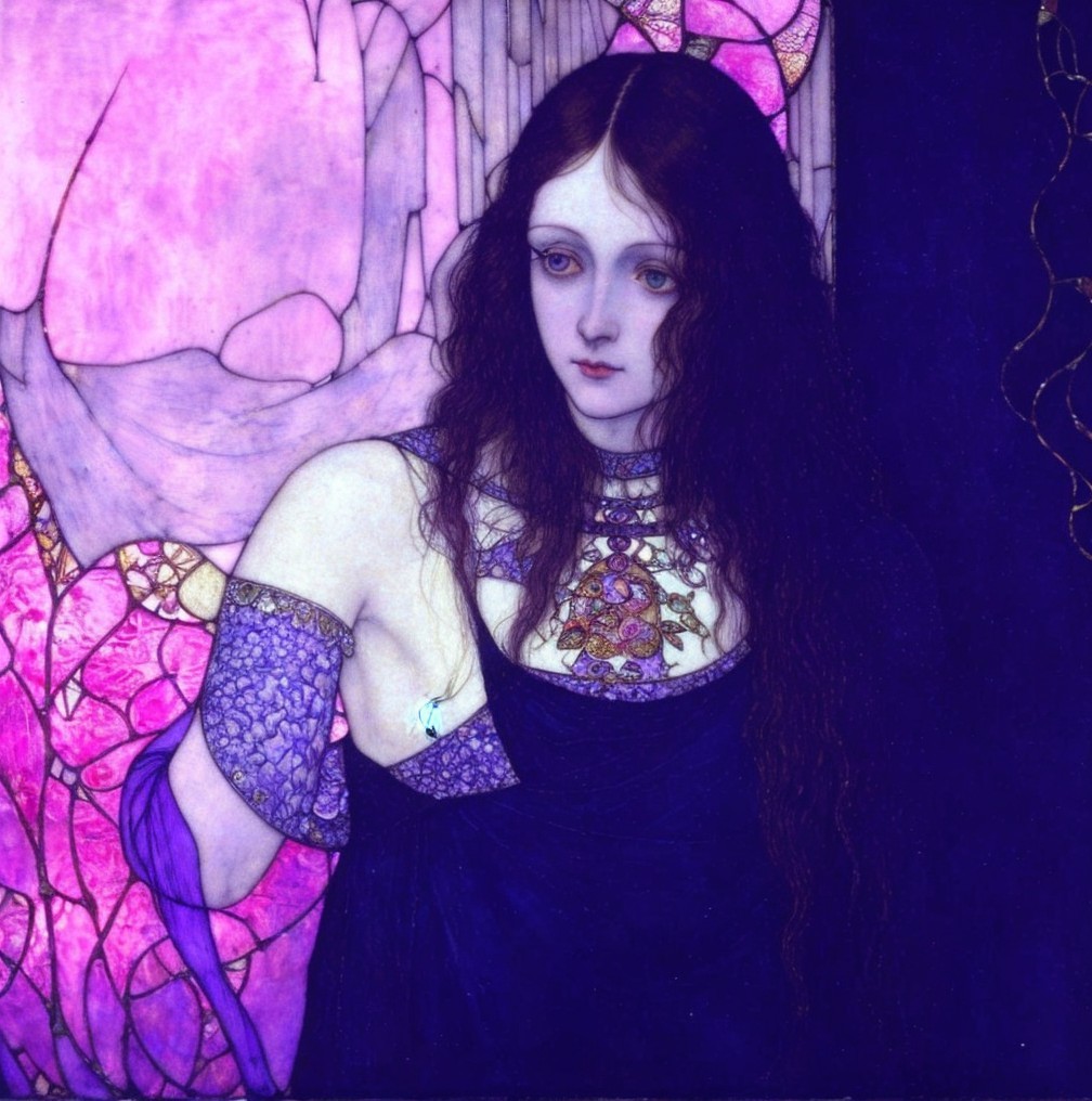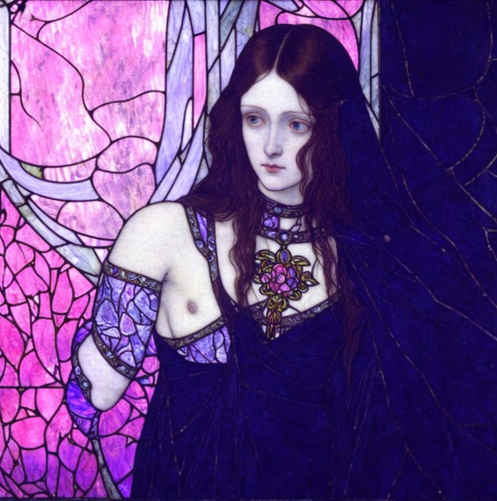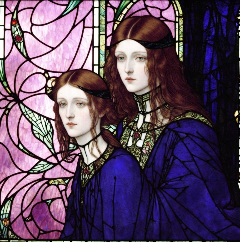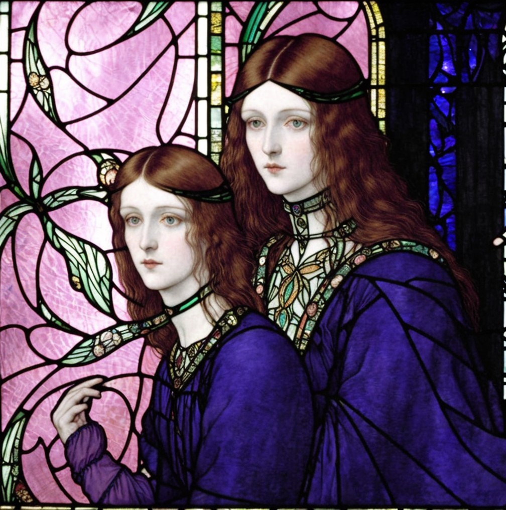 The image features two women with long, flowing hair, dressed in purple garments, set against a vibrant stained glass backdrop adorned with floral motifs. Their expressions are serene and introspective.