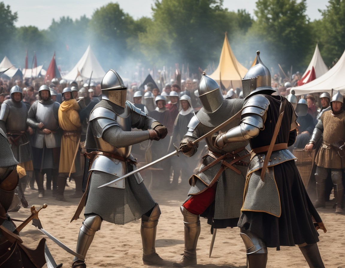 Prompt: "Two knights in the year 1230 (early middle age) fighting on the flea market. The crowd is gathered around them.