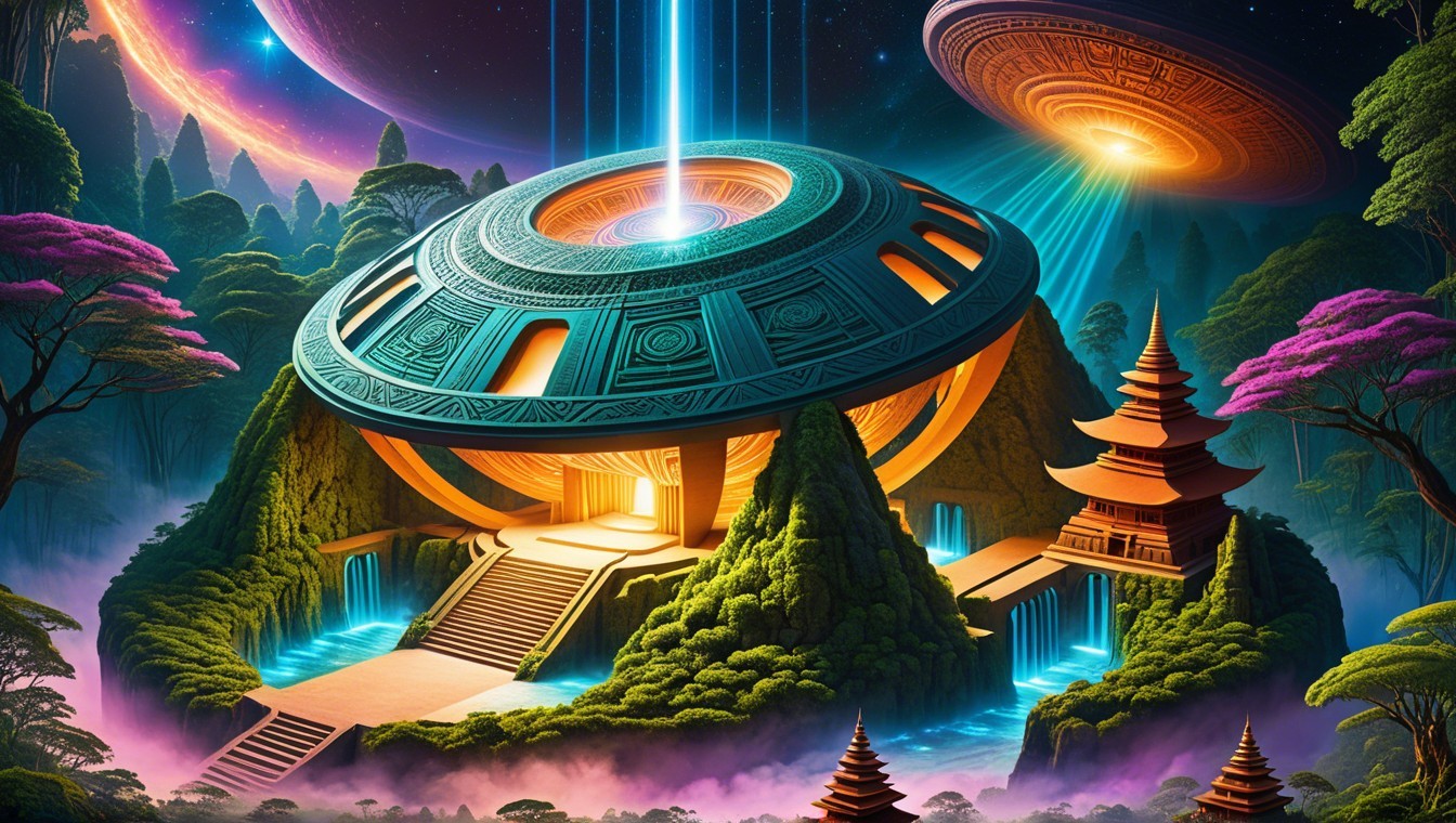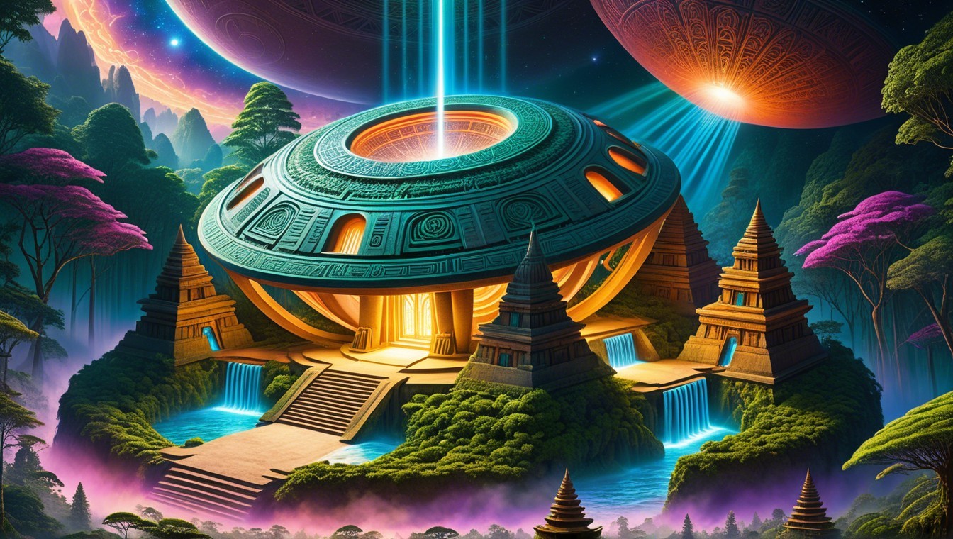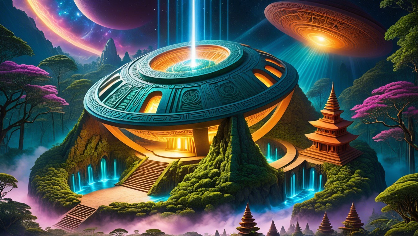 A fantastical scene featuring a futuristic dome structure surrounded by lush greenery, towering mushrooms, and mystical waterfalls, illuminated by beams of light from hovering spacecraft.