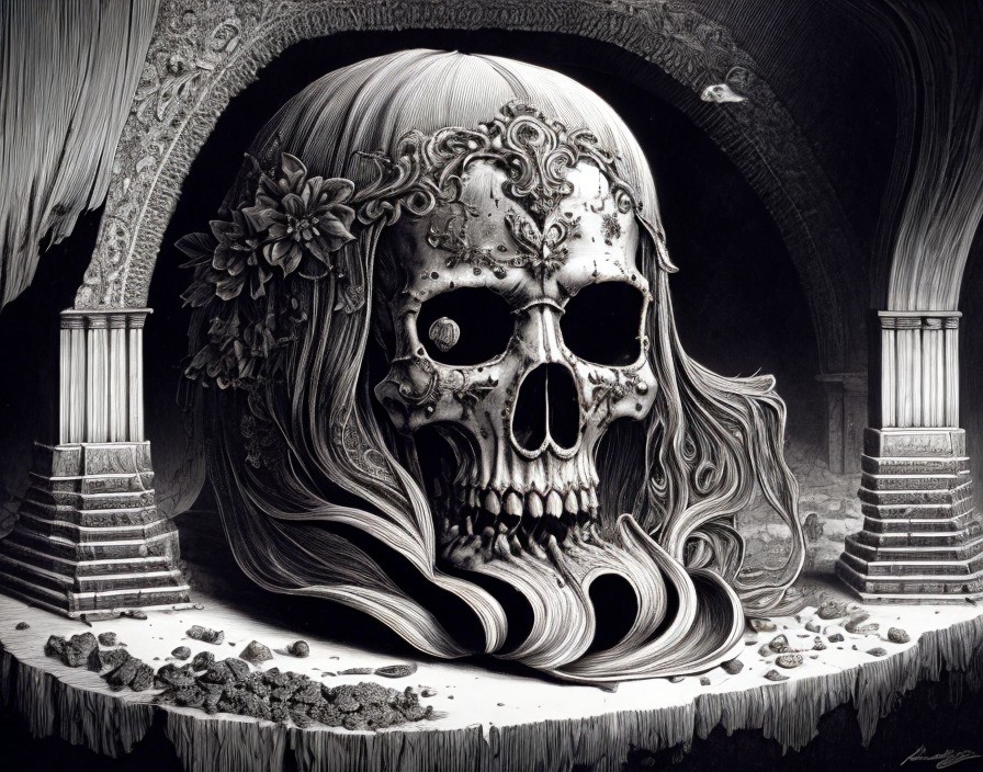 Monochrome image of person with feathered headgear and facial markings