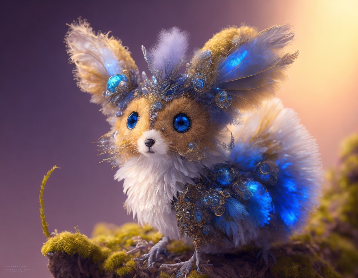 A fantastical creature with large, blue eyes, fennec fox-like ears, feathered wings, and ornate metallic adornments sits in a mystical setting.