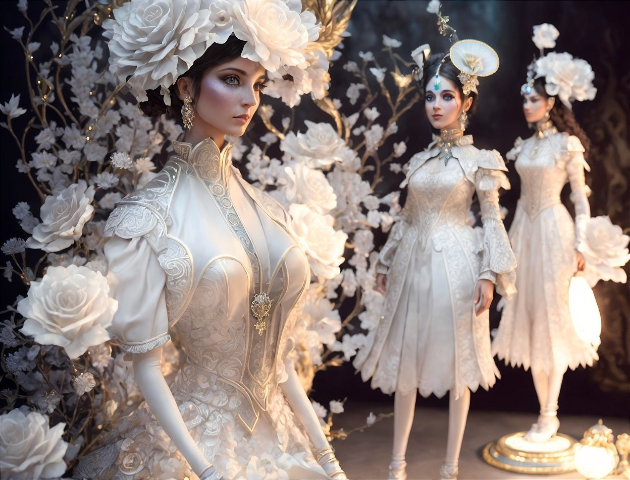 (Try from another user) - The image features elegantly dressed figures in white gowns, adorned with intricate floral details. Their ethereal appearance is complemented by elaborate backgrounds of flowers and ornate decor.