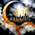 A whimsical, moonlit landscape features a gothic castle with pointed towers, illuminated windows, and swirling clouds. Abstract orange and black shapes create a dreamlike, magical atmosphere.