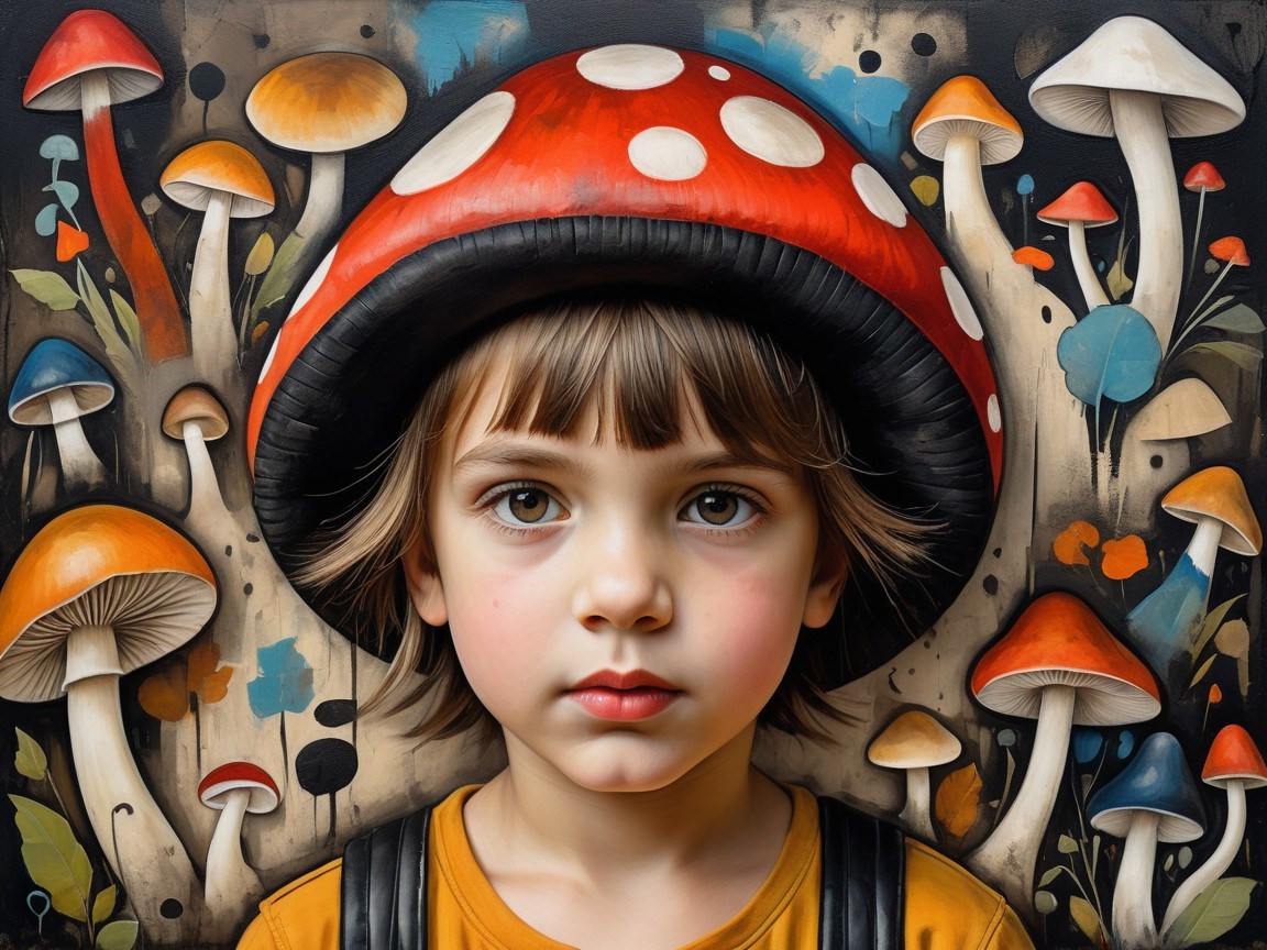 A young child with striking green eyes wears a whimsical red mushroom hat, surrounded by colorful mushrooms in a vibrant, enchanted forest setting. The artwork exudes a magical, fairy-tale vibe.