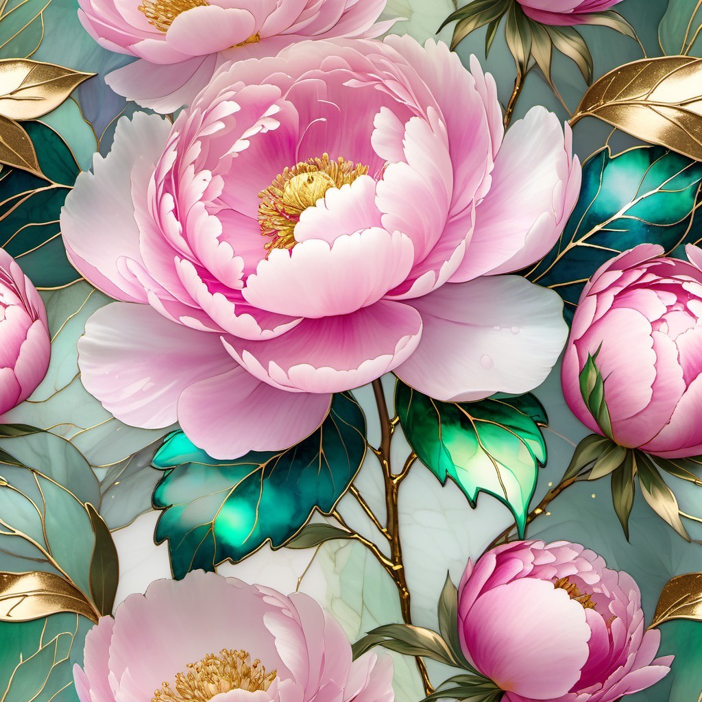 Vibrant pink peonies with golden leaves on a soft background, creating an elegant floral design.