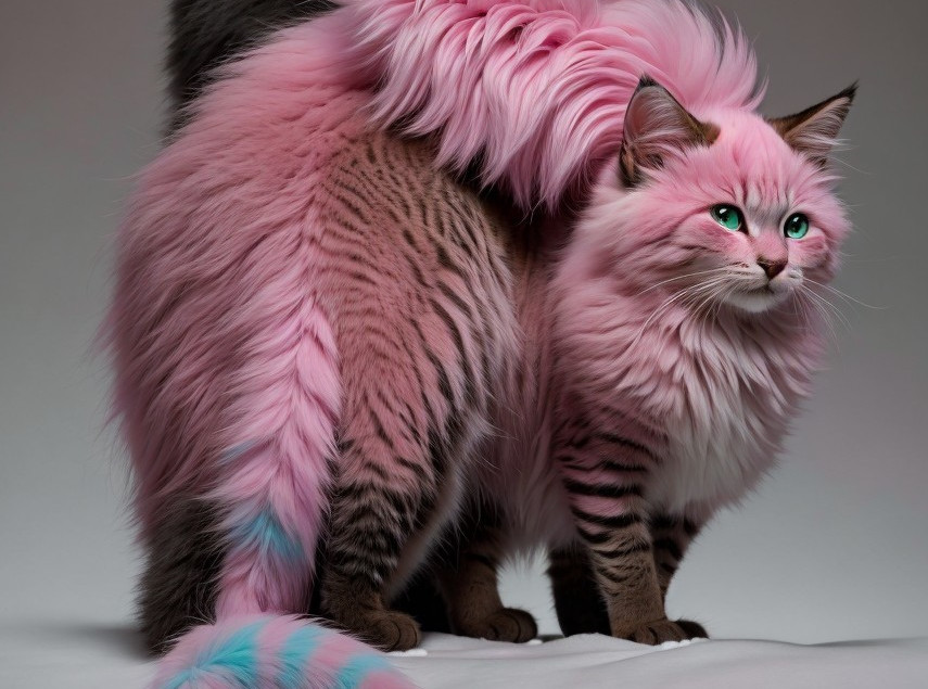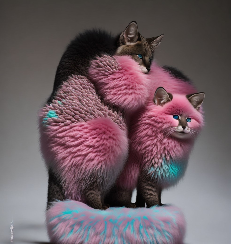 extremely cute furry forest animal, pastel pink fur with turquoze stripes, long fur, big pink eyes, one central cat