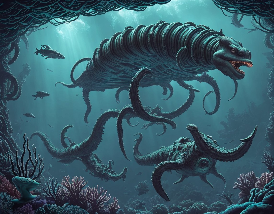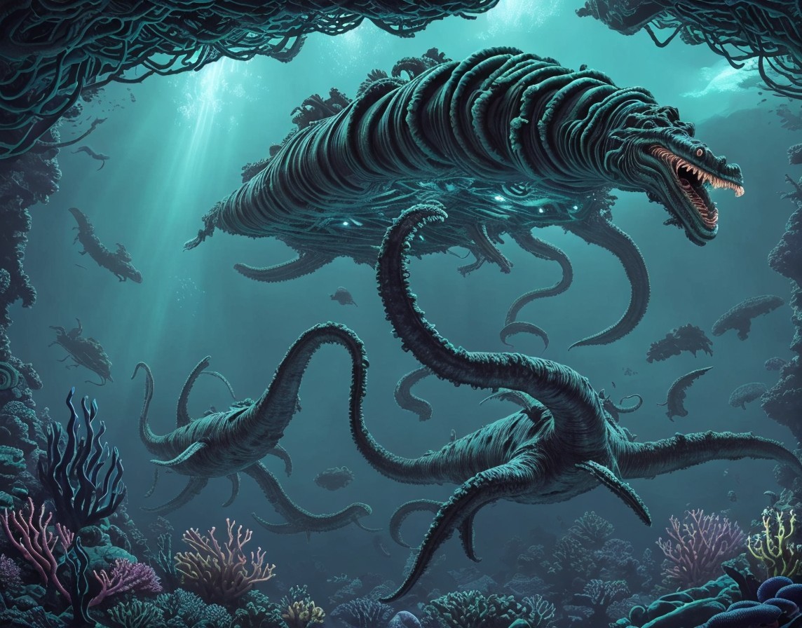 + Prompt:Sea monster, kelp forest, Underwater ship, USO, unidentified submerged object, Extraterrestrial sea monster assimilated with advanced alien technology in a deep-sea aquatic landscape. Dynamic landscape with massive ravines and a bioluminescent coral reef, statues of neptune, fish, squid and octopuses, large jagged phosphorescent crystals. Cthulu like sea monster with long tentacles and wings. sacred geometry, mystical, Realistic and natural elements, In the style of Cameron Gray