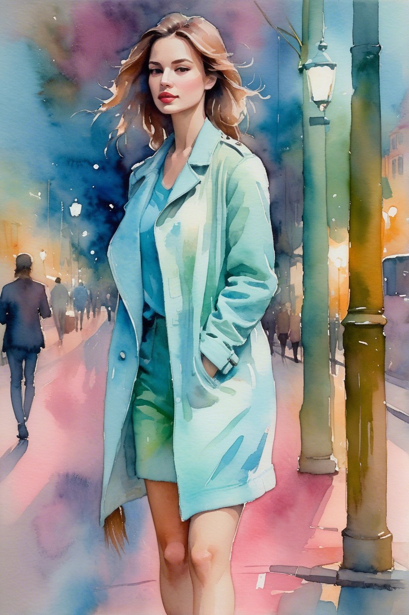 A stylish woman with flowing hair walks confidently down a vibrant street, dressed in a light blue oversized shirt and shorts, illuminated by streetlights against a colorful, dreamy backdrop.
