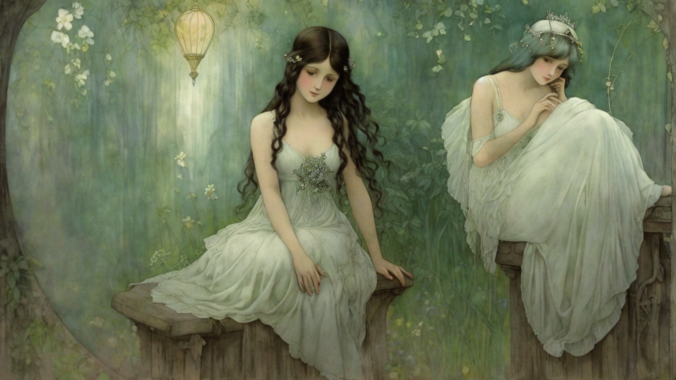 Two ethereal figures sit in a lush, green setting. One is deep in thought, while the other appears serene. Both wear flowing white gowns, adorned with flowers, evoking a mystical, tranquil atmosphere.