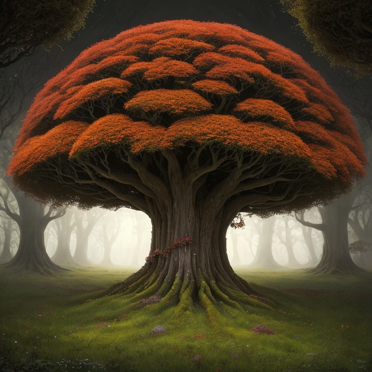 Majestic tree with vibrant red foliage in misty forest scene