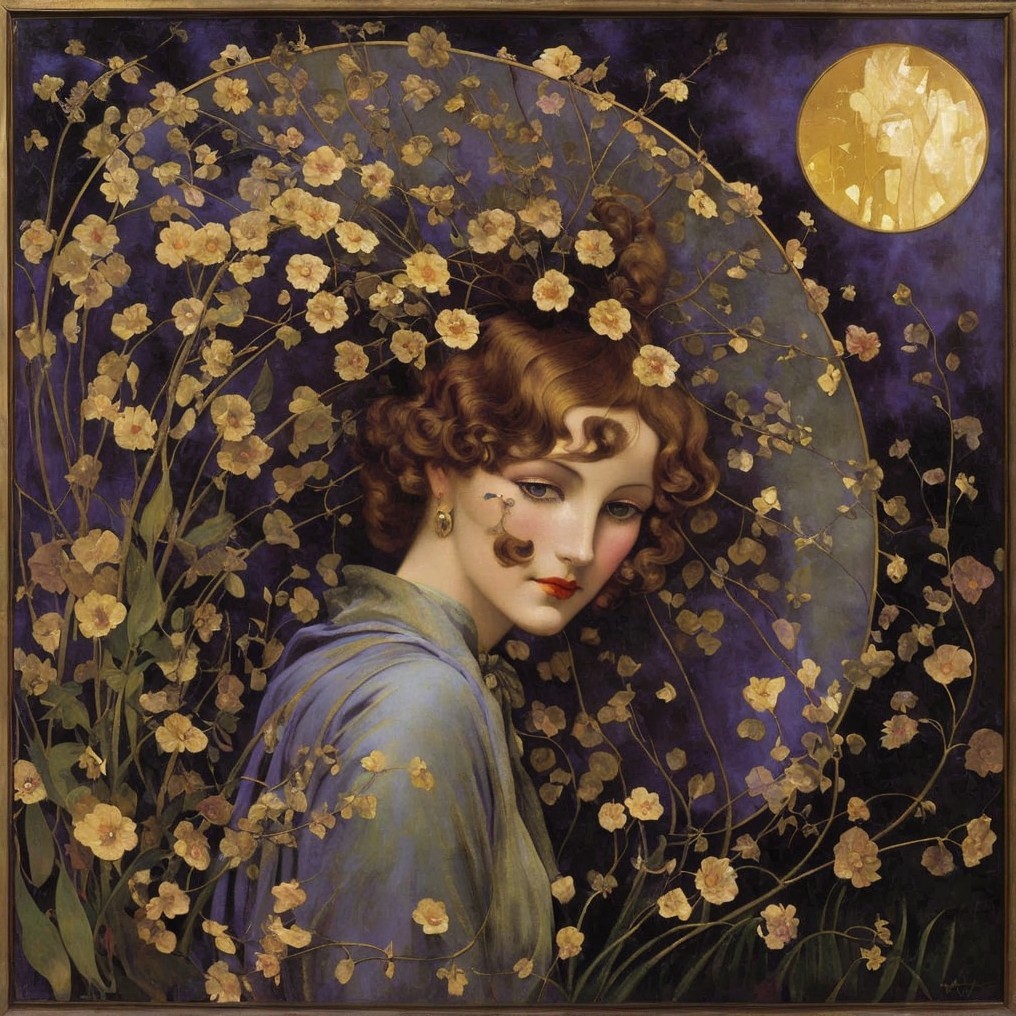 The image features a serene woman with curly hair adorned with flowers, set against a moonlit background. Her elegant dress and poised expression evoke a sense of mystique and beauty.