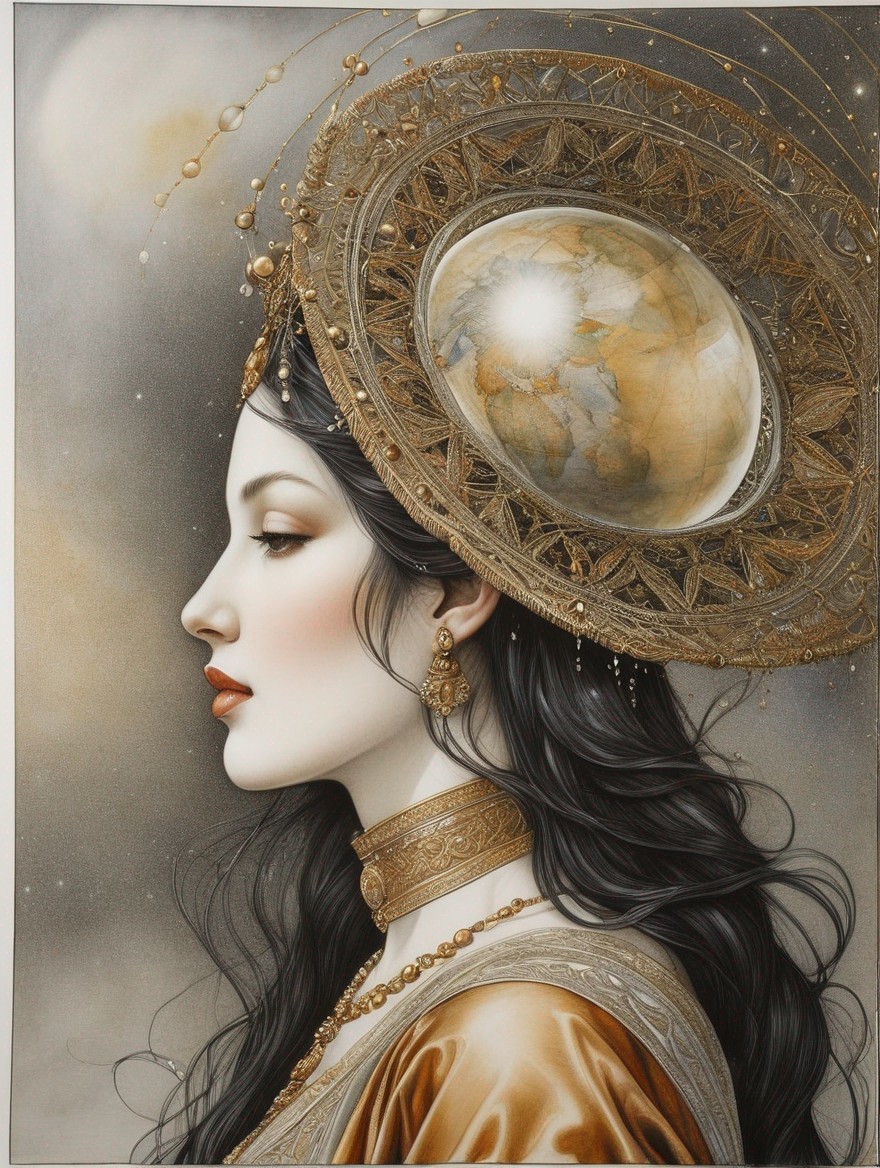 An illustration of a woman with an ornate headdress resembling a planet, with intricate gold details and pearls, exuding a regal aura.