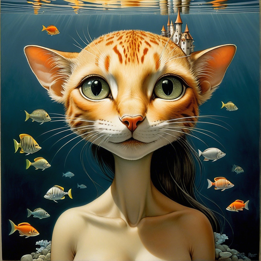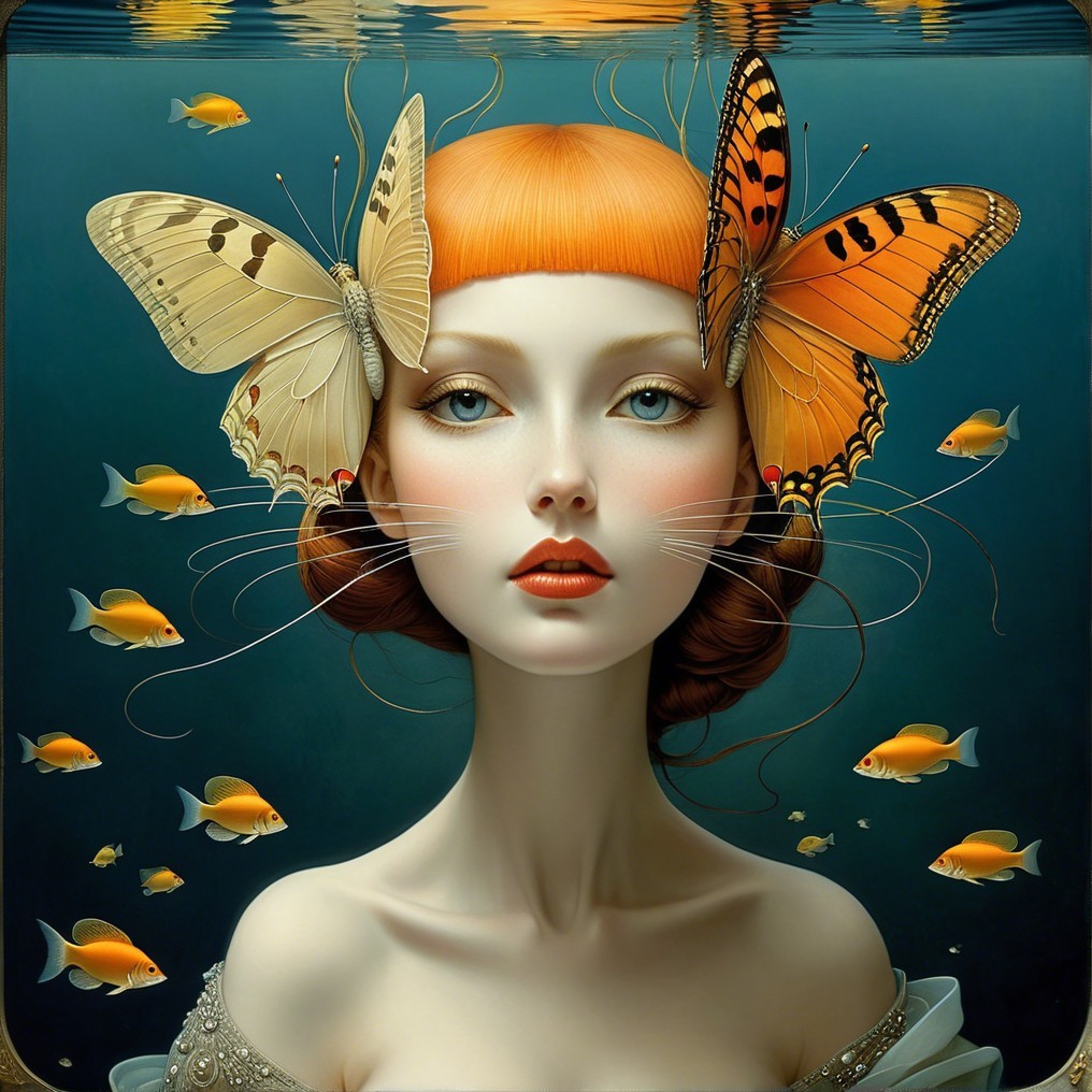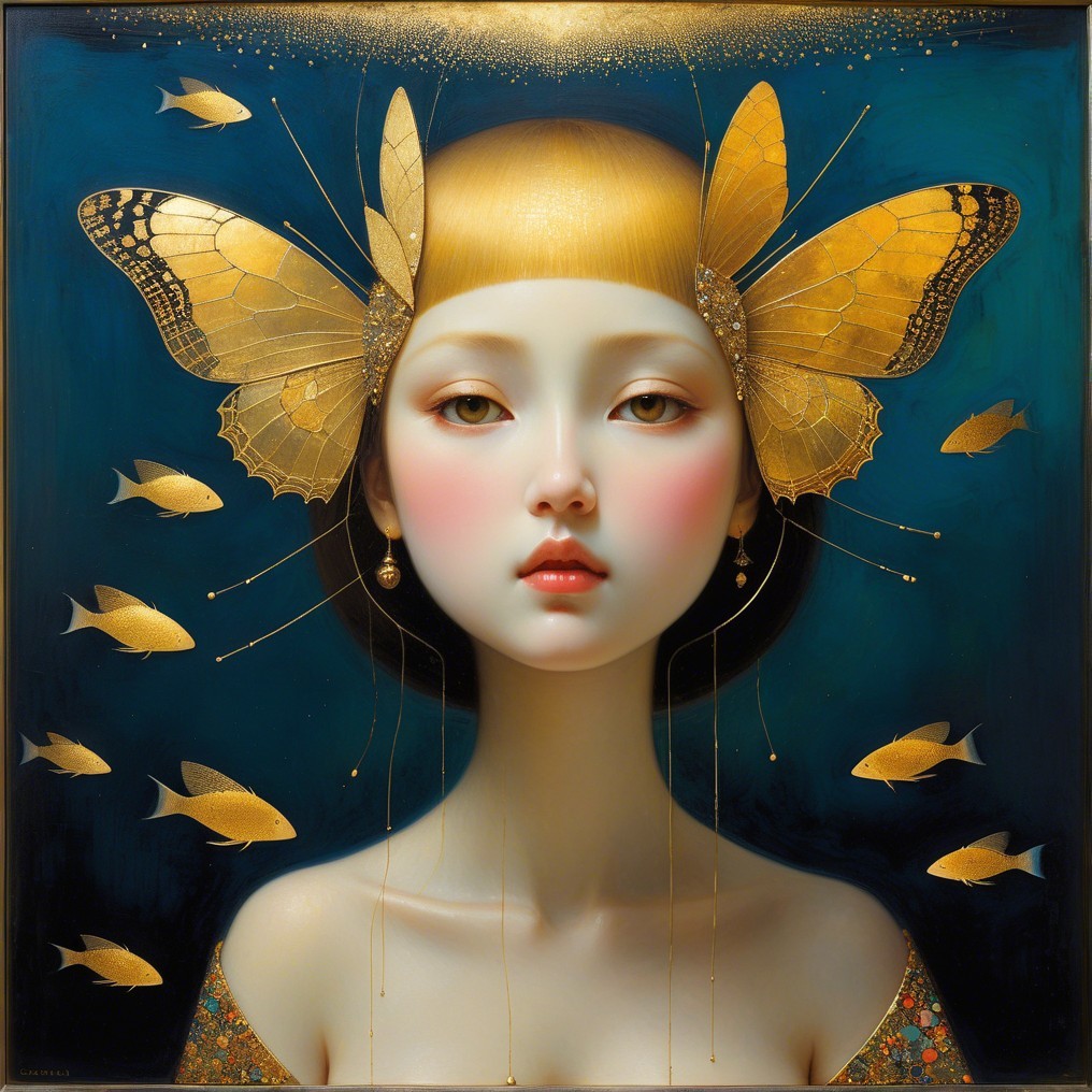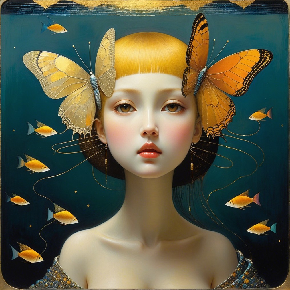 A captivating artwork featuring a serene young woman adorned with ornate butterfly motifs and geometric patterns, framed by a rich blue background, blending elegance and fantasy.