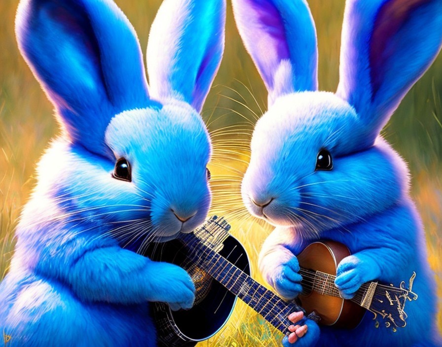 Blue Rabbits Playing Guitar in Golden Grass Setting