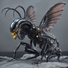 A vibrant bird with green plumage and striking features, including an elaborate crest and bold facial markings, perches on a branch. Its wings are partially spread, showcasing its beauty.