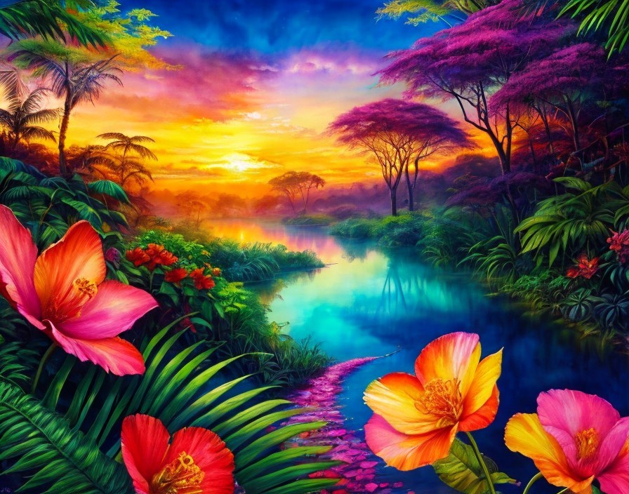 A vibrant, colorful painting of a tropical sunset with large flowers in the foreground, a river, and lush foliage.