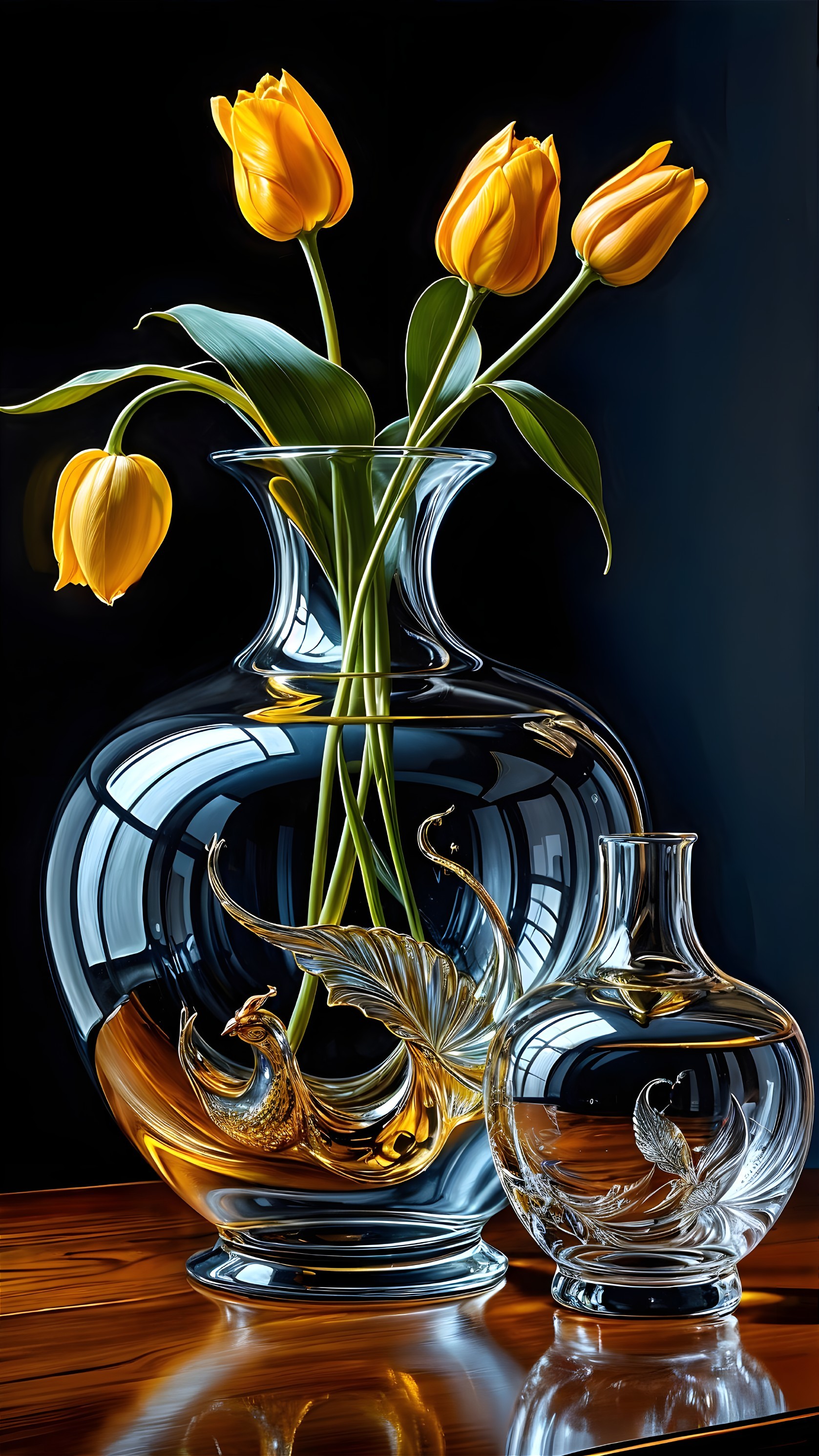 A stunning still life of a glass vase showcases intricate details and reflective surfaces. The rich textures and atmospheric lighting create a hyperrealistic masterpiece with a vivid color palette and elegant composition.