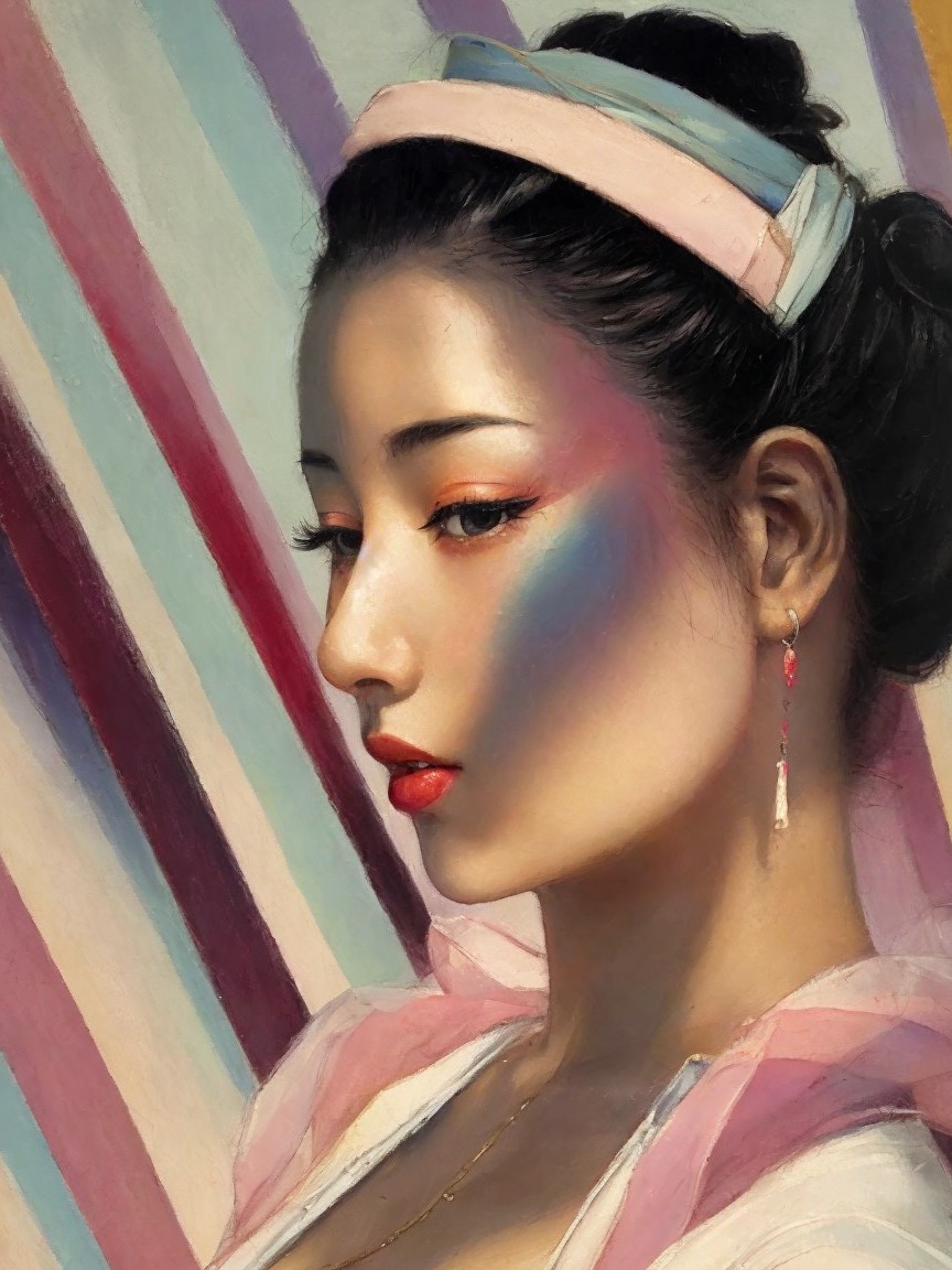 A striking portrait of a young woman with delicate features, featuring vibrant makeup and a soft expression. She wears an elegant headband, framed by colorful, diagonal stripes in the background.