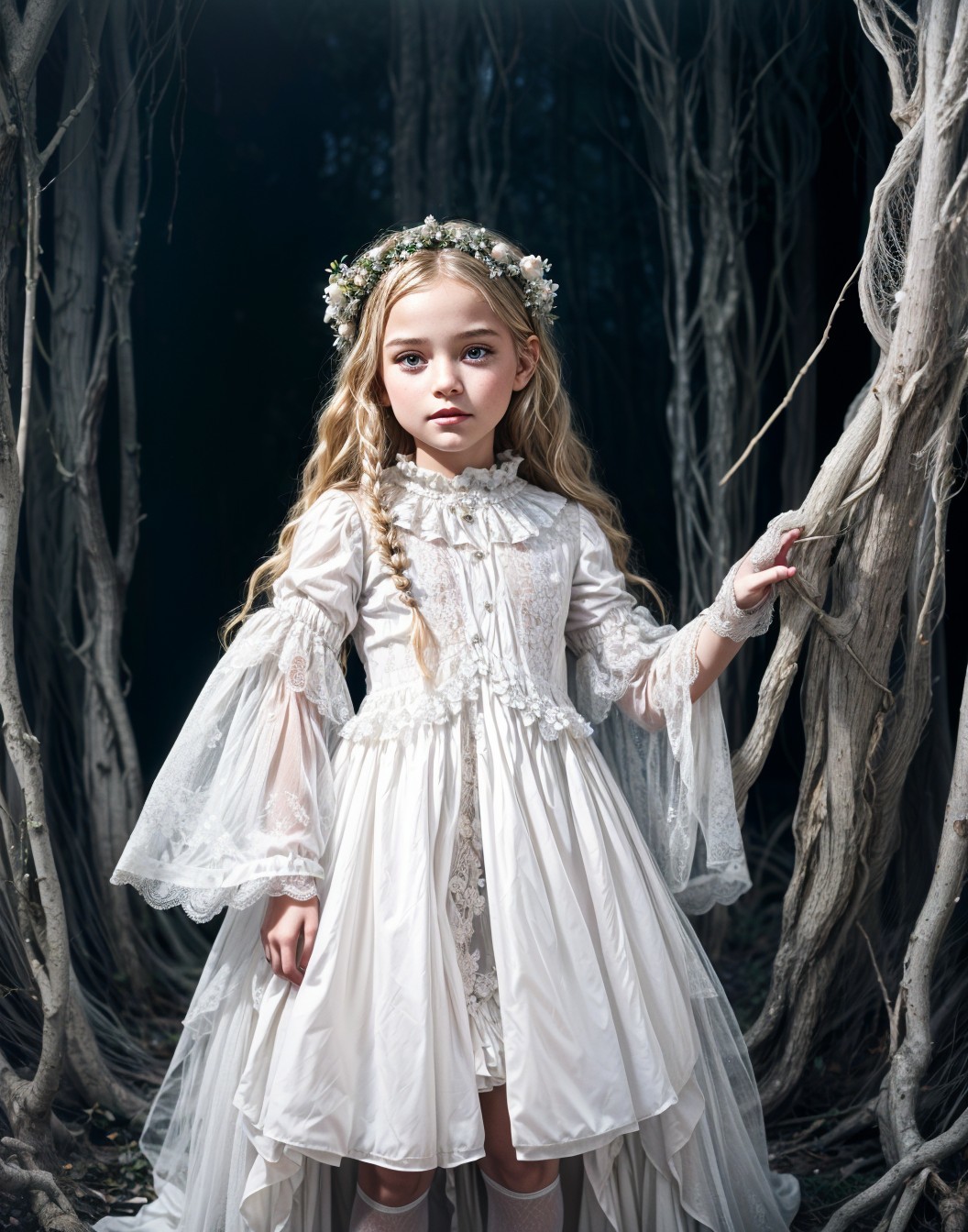A young girl in a whimsical white dress stands amidst dark, twisted tree trunks. Her long, flowing hair is adorned with a floral crown, creating an enchanting, ethereal atmosphere. The true horror of an AI never shows itself as such.