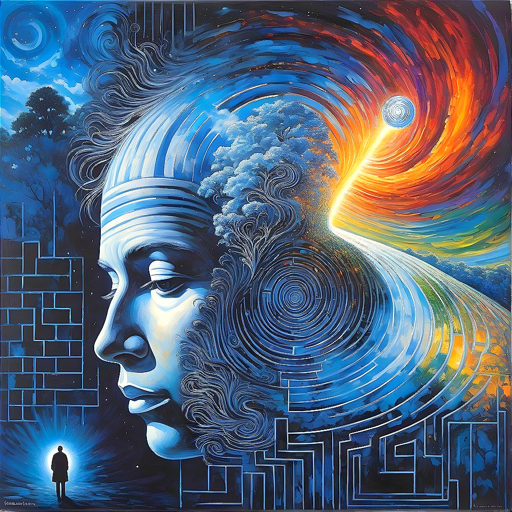 The artwork features a striking face merging with vivid landscapes and swirling colors, symbolizing the journey of the mind through nature and abstract thought, blending reality and imagination.