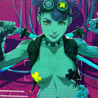 A futuristic character with vibrant green skin and bright yellow eyes, dressed in edgy attire with neon accents. She exudes confidence, surrounded by colorful neon lights in an urban setting.