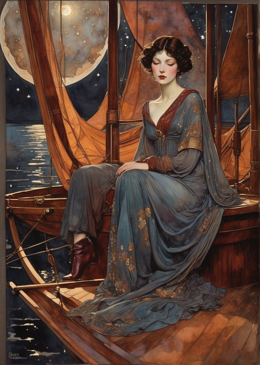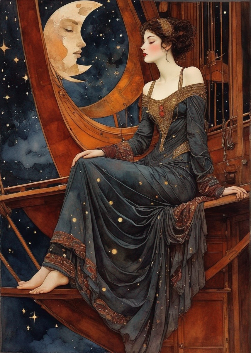 Illustrated woman in dark dress touches full moon on wooden beam.