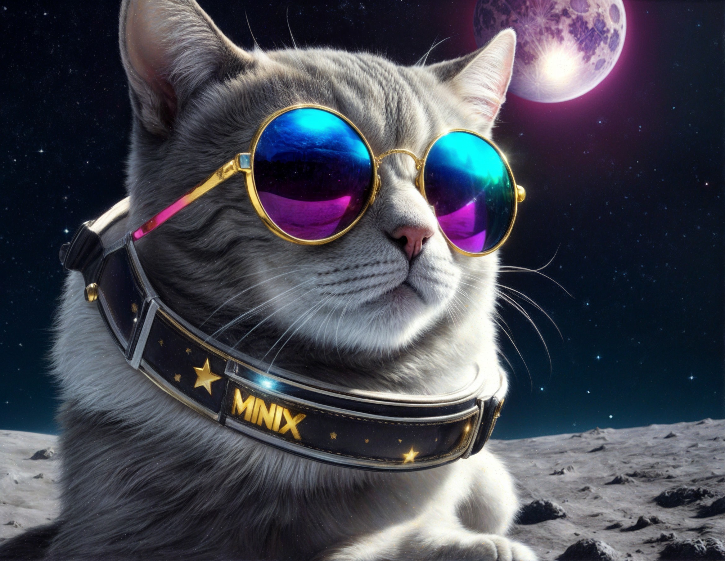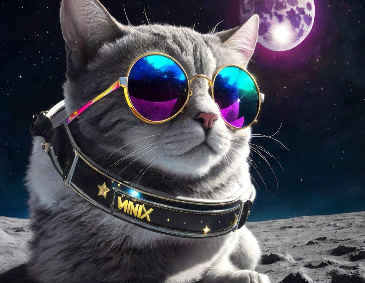 A stylish cat in reflective sunglasses and a space collar lounges on the moon's surface, with a vibrant cosmic backdrop featuring a distant planet. It exudes a cool, adventurous vibe.