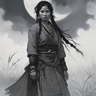 A young girl stands in a mystical landscape, wearing a flowing blue garment adorned with floral patterns. The moonlight illuminates her figure, surrounded by wisps of mist and tall grasses.