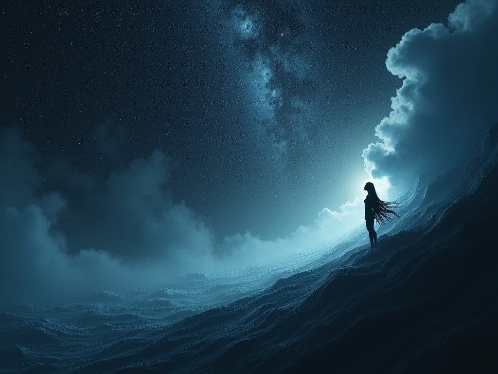 (EssentiallyRei) A solitary figure stands on a wave under a starry sky, surrounded by ethereal clouds. The scene evokes a sense of mystery and tranquility, blending ocean and cosmos in a surreal atmosphere.