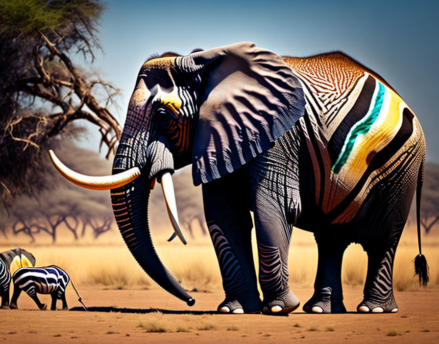 Colorful Painted Elephant in Sunny Savanna with Small Elephant and Acacia Tree