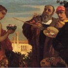 The image depicts two men in historical attire, one holding a wooden spoon and the other a decorated dish. They stand against a classical architectural backdrop filled with vibrant flowers.