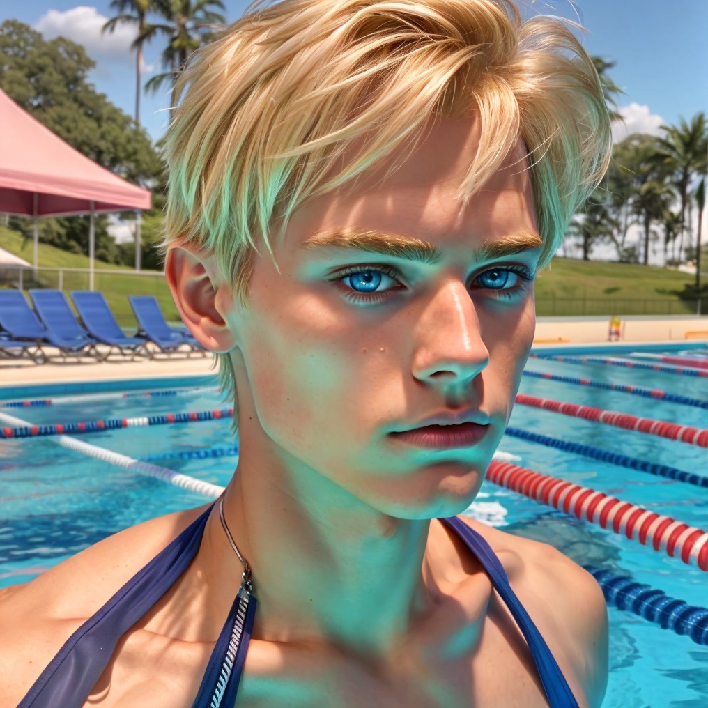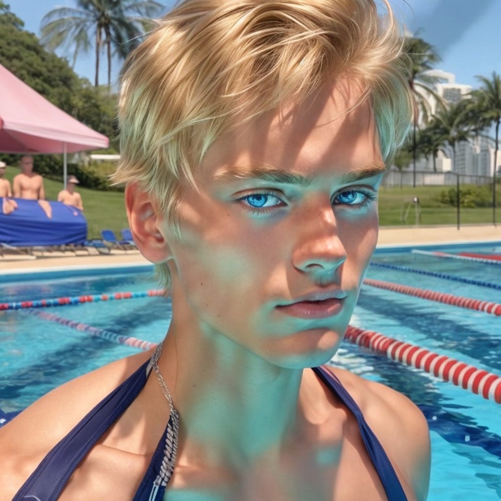 A young person with blonde hair and blue eyes wearing swimwear by a poolside, with swimmers in the background.