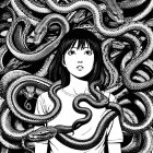 A vibrant scene featuring a LEGO figure of a woman with long brown hair, surrounded by colorful LEGO snakes and playful building blocks, creating a whimsical atmosphere.