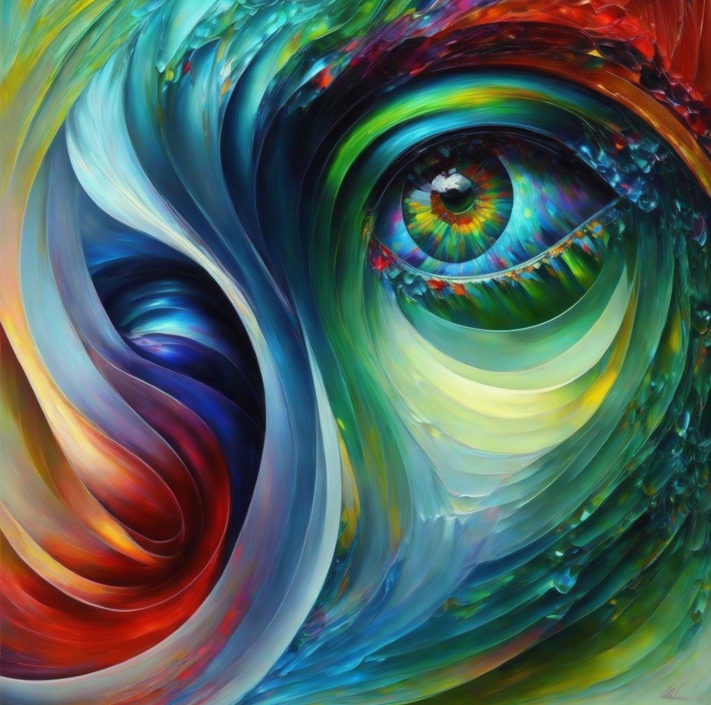 A vibrant, colorful painting of a stylized eye with swirling patterns and a mosaic-like iris, evoking a sense of movement and energy.