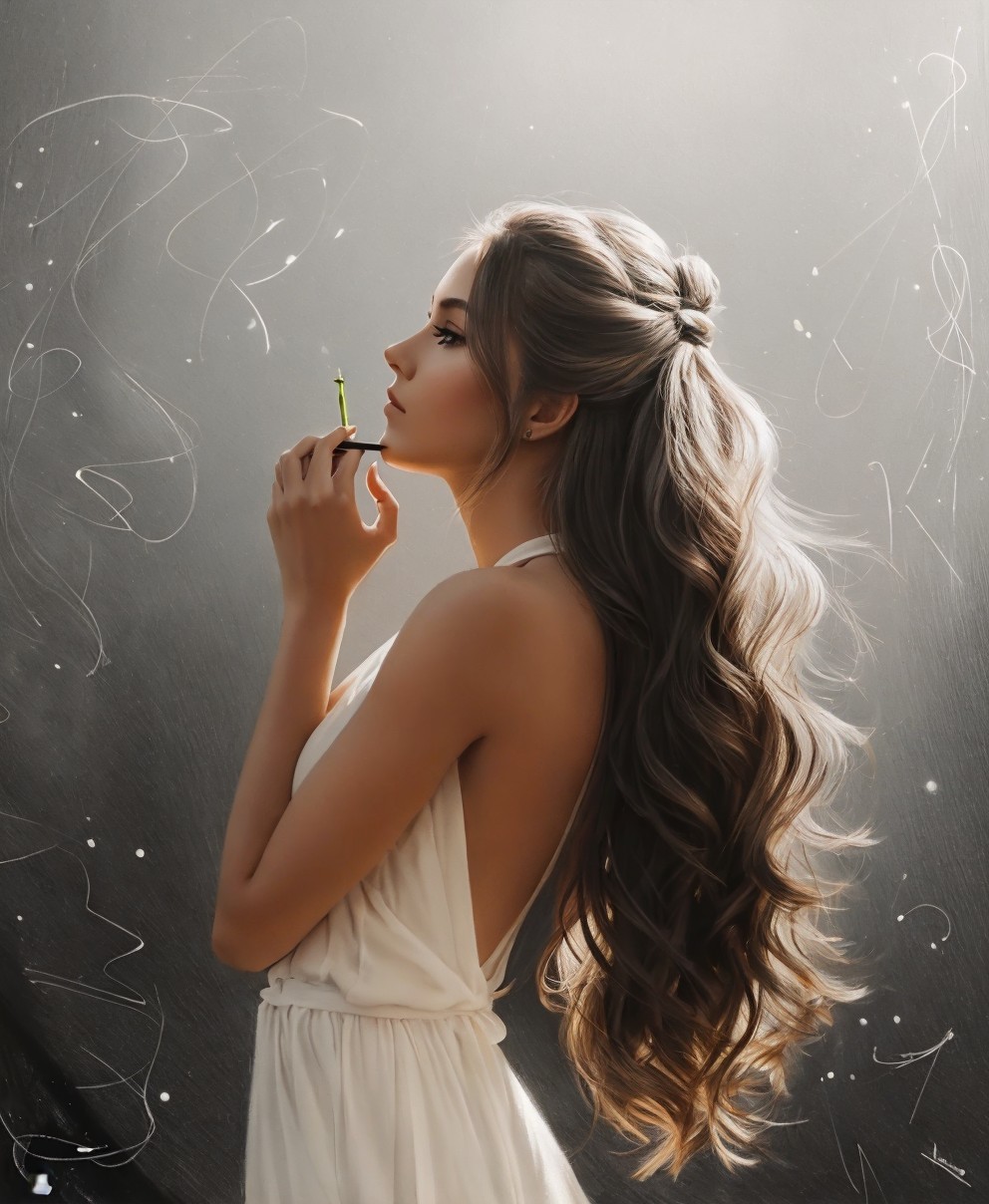 Black and white pencil sketch of a beautiful woman holding single match in front her face where the soft yellow light illuminates her beautiful features. she has her hair tied up in a messy bun with some strands of hair falling in her face.