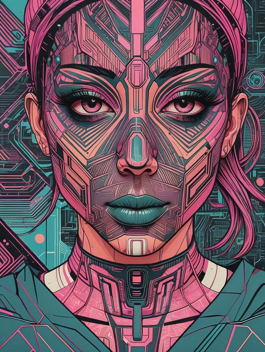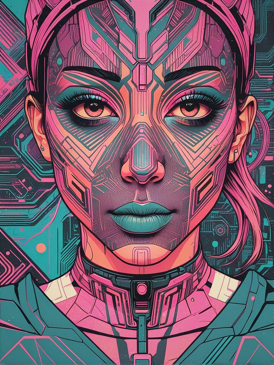 + Prompt:Feminine futuristic cyberpunk and foampunk portrait, stylized female headshot blending abstract sci-fi elements with bold outlining with naive art featuring geometrical 3D effects, linocut by Brock Hofer, black brushstrokes adding depth, dyed by Man Ray, line-art, thick textured layers, contoured, tactile feel, simplistic features, intricate detailing, warm coloring enhancing the fantasy ambiance, detailed vivid coloring and stacked lines, industrial design, sgrafitto reminiscence, parallax occlusion, stacked lines, geometrically structured, smeary,brightness 1.5, visible textures, quaint, fusion of geometrical styles with elements of foampunk, detailed line art to create a whimsical and psychedelic ambiance, traumacore with hatching details and a soft, ethereal atmosphere, fantasy elements, precise execution. Stacked lineage blends elements influenced by Stan Lee and Ho Baron and William Bradley, zentangle shapes, estranged crimson red hues, rich burnt orange tones, deep cobalt blue shades, warm grey accents, color gradients, abstract swirls, blending colors seamlessly, digital painting, high resolution, intricate details, dynamic lighting effects, bold and vibrant color palette, modern art style, reminiscent of pop art, infused with a 1940s retro design twist. Detailed psychedelic style, simplistic color scheme, op-art inspired by Georges Seurat and Man Ray. Incorporate intricate patterns, neon pink details, warm 3 point lighting, metallic textures, holographic elements, harsh coloring, retro-futuristic gadgets, and a touch of surrealism. Illuminate with vibrant and contrasting colors, emphasizing shadows and highlights, creating a visually striking composition, collagraphy, great depth and scale, tousled scene, delicate tones in a indiecore style, multi-perspective, multi-dimenstional, stylized trees with exaggerated features, hues by Ed Binkley, rough paint accentuating her features, color palette of light-yellow light green auburn, golden hour, abstract,