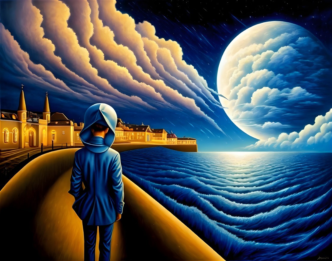 Man in Blue Suit on Coastal Pathway Under Full Moon
