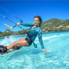 A young woman enjoys kitesurfing on clear turquoise waters, wearing a colorful wetsuit. Her hair flows in the wind as she glides across the surface, exuding joy and excitement.