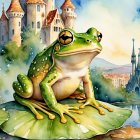A whimsical watercolor landscape featuring majestic, fairy-tale castles with intricate towers, surrounded by lush greenery and a dreamy sky, evoking a sense of magic and wonder.