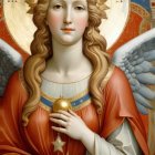 The image features a serene angelic figure with flowing, golden hair and ornate attire in warm hues. She holds a golden orb, surrounded by intricate patterns and soft light, exuding grace and tranquility.