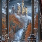 A cozy winter scene from a window, featuring an open book, a lantern, and colorful leaves. Outside, a majestic castle is covered in snow, surrounded by evergreens and gently falling snowflakes.