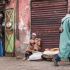 The image depicts a street scene with a woman carrying a basket of tomatoes, two children nearby, and a man sitting against a wall, all set against a backdrop of colorful, weathered buildings.