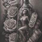 A glamorous woman in a silver outfit, adorned with jewelry, poses among colorful, oversized candies and roses. Her bold makeup and flowing hair create a striking, whimsical scene.
