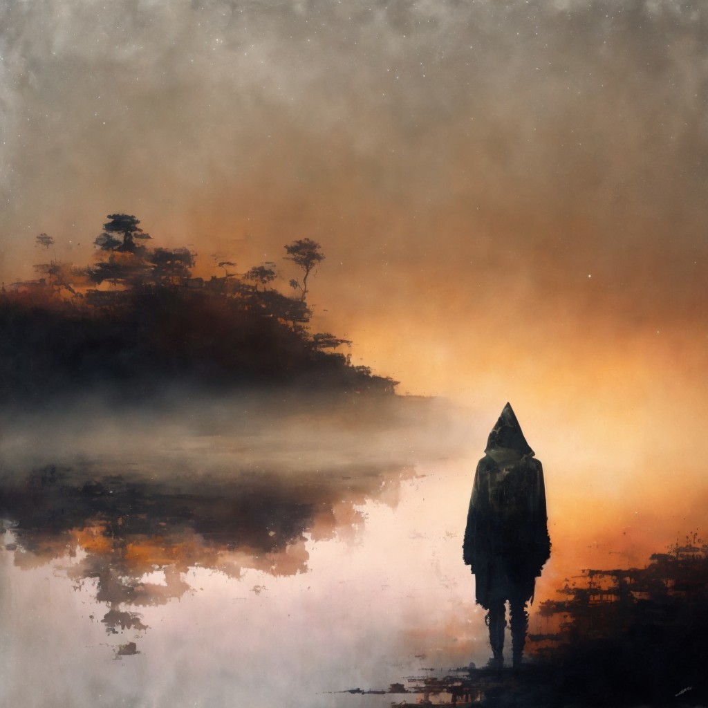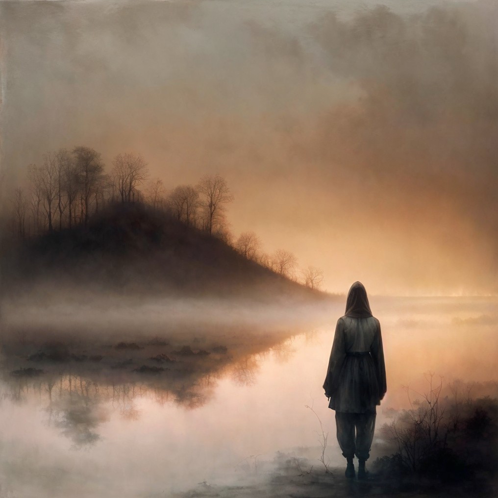 A serene landscape features a hooded figure standing by a misty lake at sunset. Birds soar above, and trees line the distant shore, creating a tranquil, mystical atmosphere.