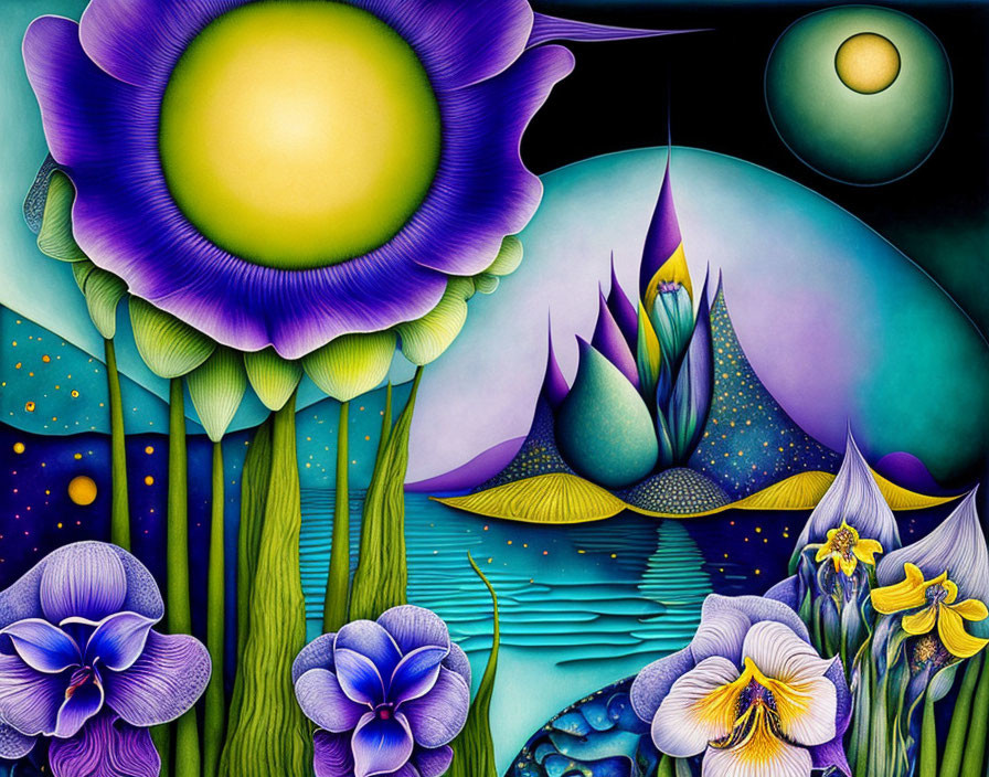 +Wild Irises Under Starlight Dreamscape: Salvador Dali collaboration Paul Klee and Tim Burton, Picasso's integrated flowing composition, colorized brooding grayscale balanced by many bright colorful details