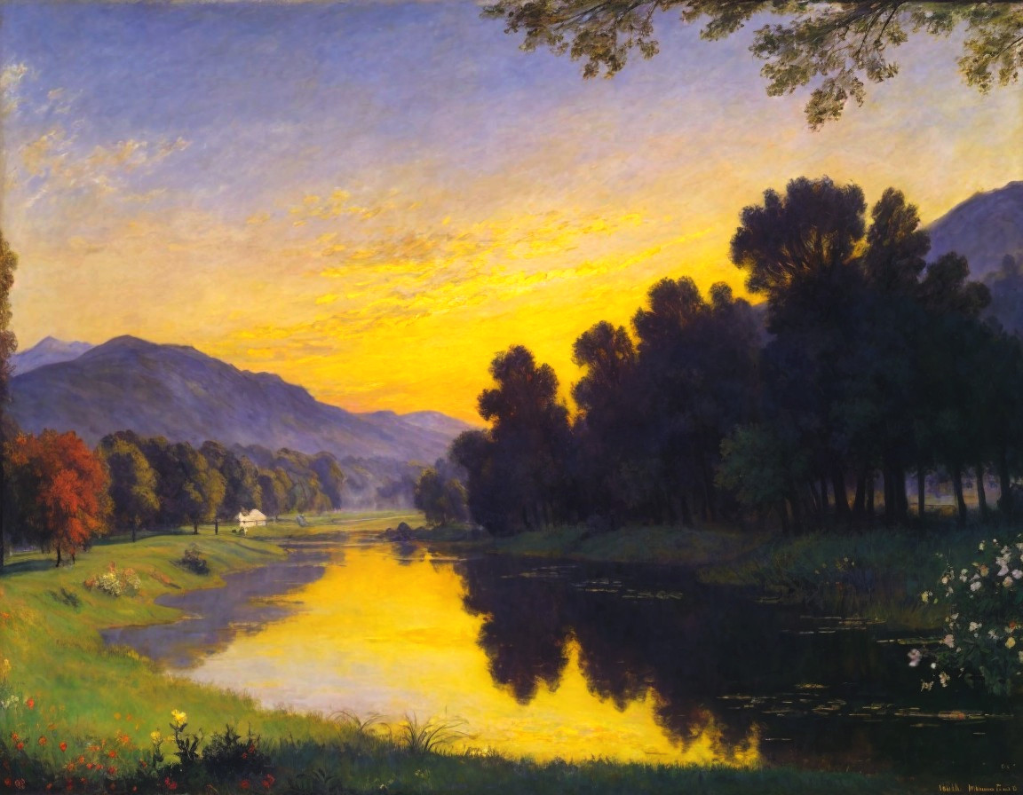 Prompt: "Oil on canvas. Wide angle landscape view, a magnificent mist sunrise at a spring with river and mountains . Glowing with vibrant hues. Perfect composition. By William Blake. By Claude Monet. By Edouard Manet. By Auguste Renoir. By Edgar Degas."