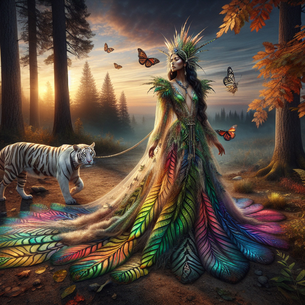 Prompt: "A mystical Native American woman, adorned in a flowing, floor-length gown with iridescent stripes that evoke the shimmering patterns of butterfly wings, leafy foliage, and the subtle nuances of moonlit tree bark, walks in harmony with a majestic White Bengal Tiger, its luminous fur radiating a soft, ethereal glow, as if kissed by the warm, golden light of a sunset on a misty forest glade. By her side, a fantastical, chameleon-like creature morphs and shimmers, its shape-shifting stripes blurring and blending with the surroundings, like the shifting hues of a summer sky at dusk. The woman's attire is intricately woven with the organic textures of rough-hewn tree bark, delicate leaves, and earthy tones, creating a symbiotic relationship between fashion and the environment, reminiscent of the organic, dreamlike landscapes of Jacek Yerka and the majestic, naturalistic forms of John James Audubon. The atmosphere is surreal and ethereal, with a hyper-detailed focus that draws the viewer into the heart of the composition, evoking the expressive brushstrokes of oil painting and the delicate, translucent washes of watercolor, characteristic of the masterful works of Gustav Klimt and Vincent van Gogh. Inspired by the bold, expressive forms of Picasso and the haunting, mystical landscapes of Caspar David Friedrich, the scene unfolds like a dream, with the intricate details and symbolism of Michelangelo's masterpieces. Volumetric lighting casts a warm, golden glow, imbuing the scene with depth and atmosphere, as if the image is alive, and unfolding before our eyes, with the artistic flair of Jeremy Mann bringing a sense of multidimensionality and frameless wonder."