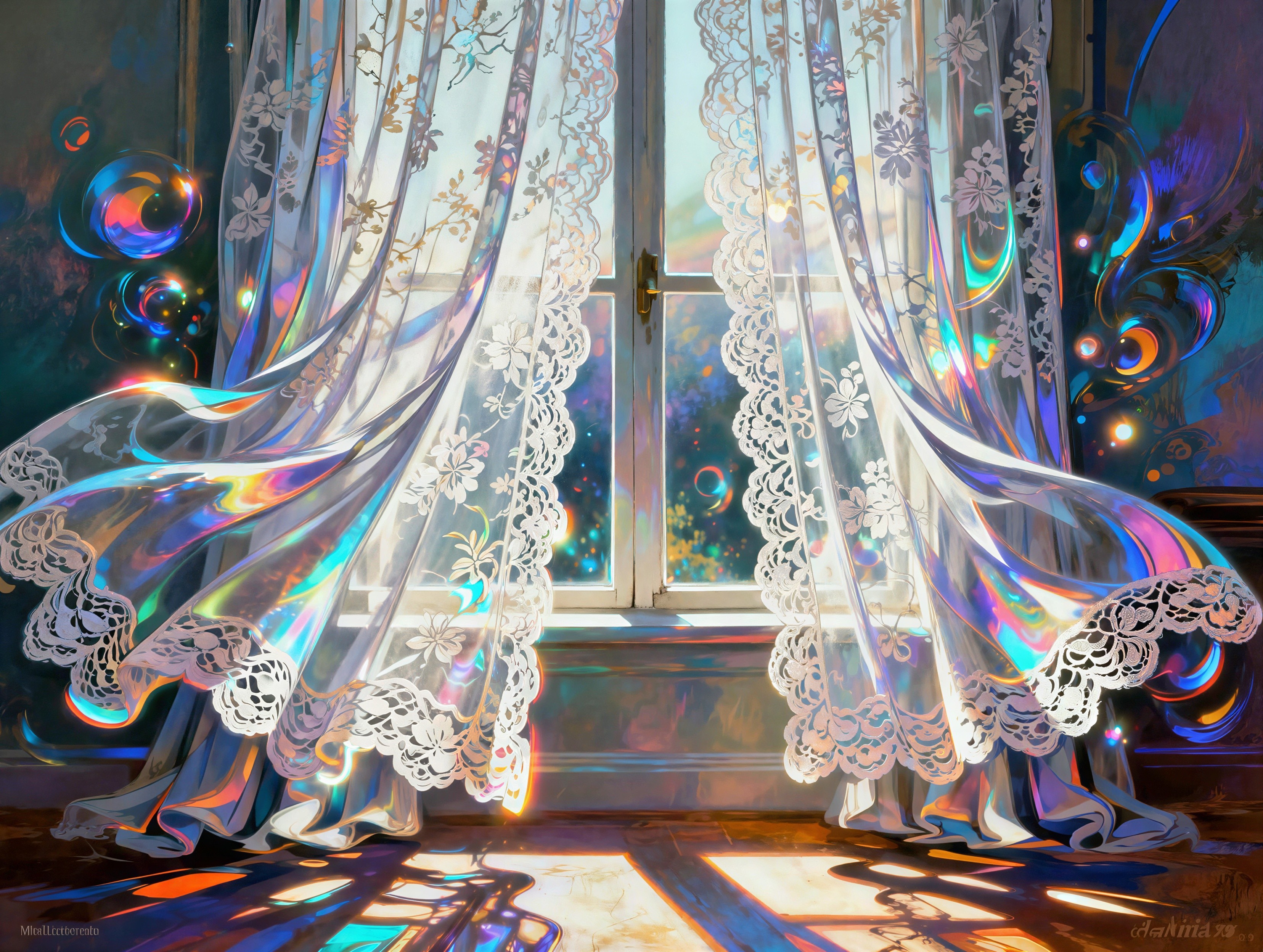 A vivid, detailed full shot of two curtains that are tied to each side of a large door, with warm, bright sunlight. The curtains are made of white, translucent lace, featuring flower and vine patterns that flutter in the breeze. The fabric is shiny and iridescent, reflecting the light in a rainbow
